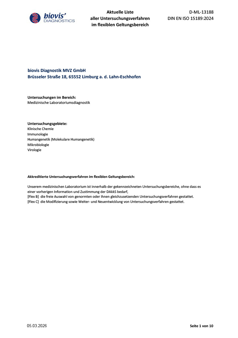 Die biovis Diagnostik MVZ GmbH ist durch die Deutsche Akkreditierungsstelle (DAkkS) nach der DIN EN ISO 15189:2024 akkreditiert – dem internationalen Standard für medizinische Laboratorien.
